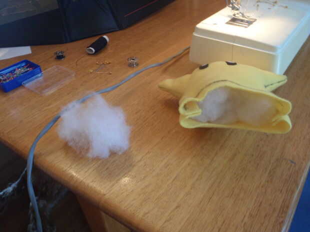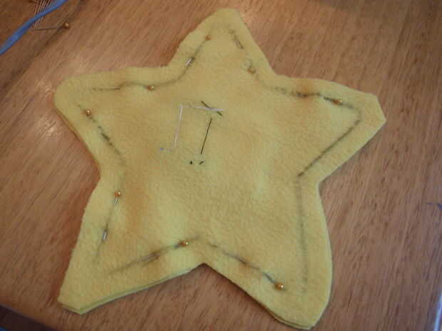 excepto el espacio entre los dos puntos de abajo (es más claro en la foto). Luego rellenar tu estrella para que sea agradable y gordo! Usé algunos relleno de fibra que tenía en el armario, utilizado para la fabricación de felpas. Asegúrese de que están rellenos de firmemente o tendrás una estrella débil :(. El pasador de los lados no cocidos con un poco doblado, por lo que es limpio. Cosa cuidadosamente hasta (lo mejor pueda). A menos que me he olvidado de algo, que probablemente, estás acabado! Hice un pequeño huevo de fieltro y se deslizó en el bolsillo.