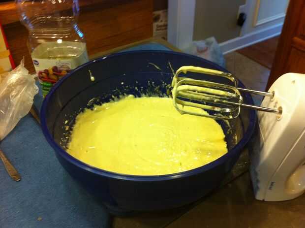 Tomar la mezcla para pastel amarillo, huevos, aceite vegetal, agua, crema agria, azúcar moreno y canela y colocarlos en un tazón grande. Utilizar un mezclador electrónico o una cuchara grande para combinar ingredientes.