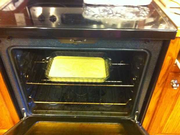 Salir un pan poner su masa de pastel en el. Utilizando a algún tipo de aceite vegetal o aerosol, slick la sartén y vierta la mezcla de pastel. Una vez que se calienta el horno a 350 grados, colocar la tarta en el horno. Ajustar el temporizador de 30 a 35 minutos.