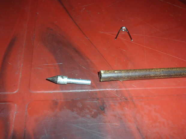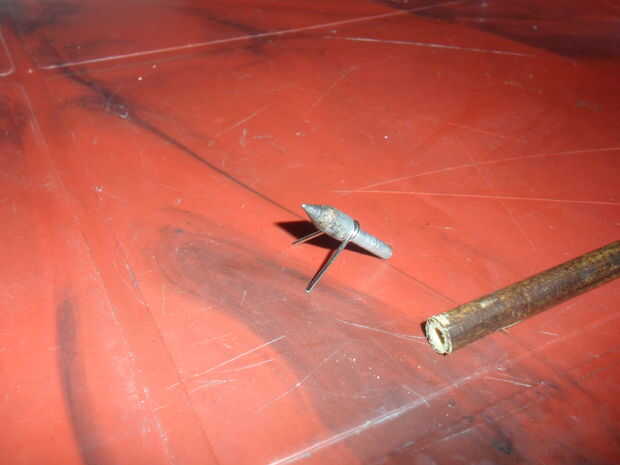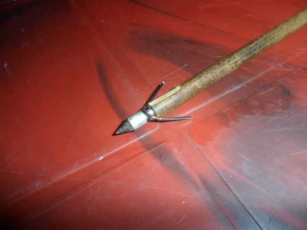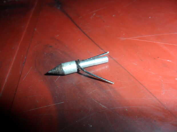 Para colocar el perno de la flecha, primero sacar la punta de flecha y deslice el lazo en el perno sobre él como se muestra. A continuación, utilizando las pinzas, curva los dos bits de pin de alambre hacia abajo manteniendo todavía les hacia el exterior. Ahora puede caber la cabeza hacia la flecha como se muestra en las fotos 3 y 4.