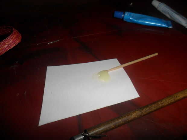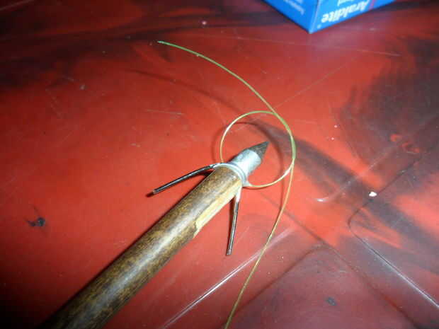 Mezclar una pequeña cantidad de araldite en un pedazo de papel y se usa para pegar la cabeza y rayos de nuevo en la flecha como se muestra en la foto 2. Haga ahora una longitud de 3 pies de la línea de pesca en la brecha entre la cabeza y el cuerpo como se muestra.