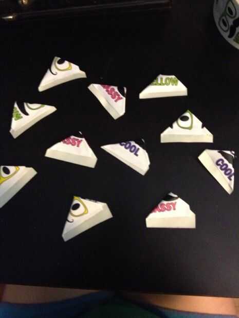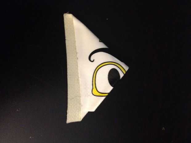 Ahora toma una de sus plazas casi de cinta adhesiva y dale la vuelta por lo que es el lado pegajoso hacia arriba. Luego tomar la esquina de la cinta y llevarlo por el lado opuesto de la pieza. Luego de hacer ese paso con la solapa que acaba de crear. Crear un triángulo en forma de punto en la punta superior y poco espacio pegajosa en la parte inferior (2 cm) y hacer un montón de ellos.