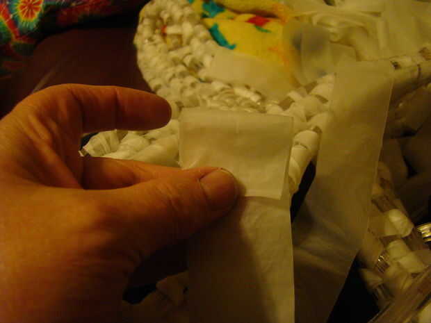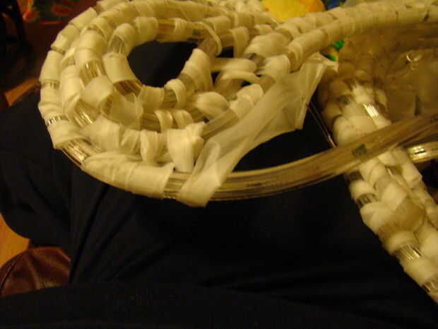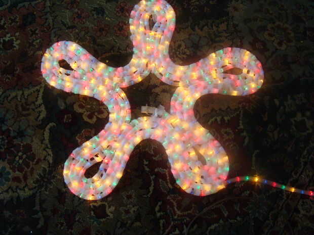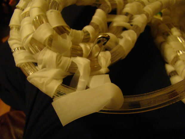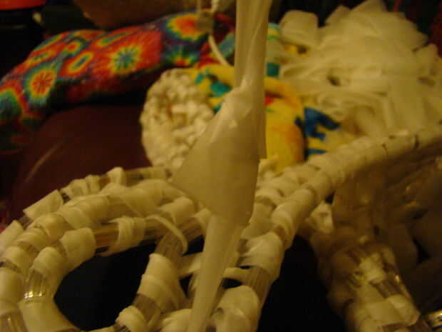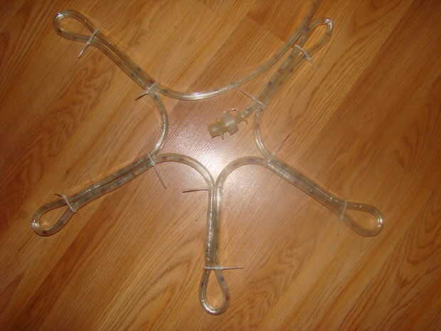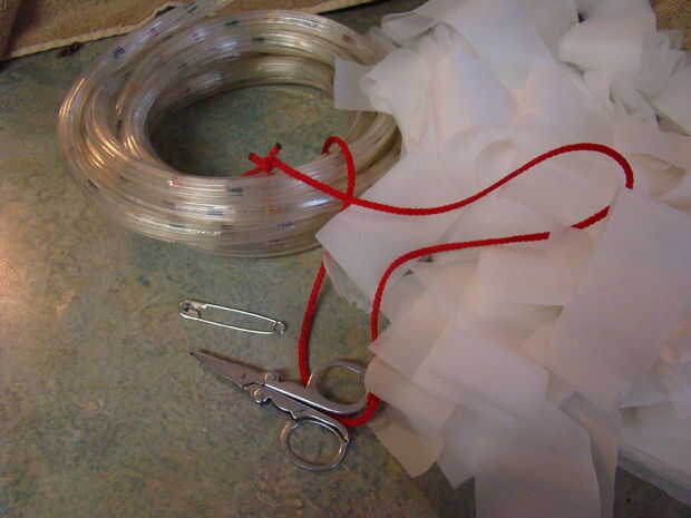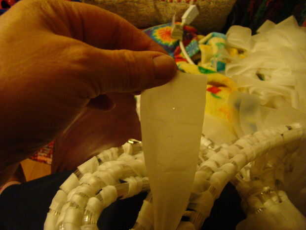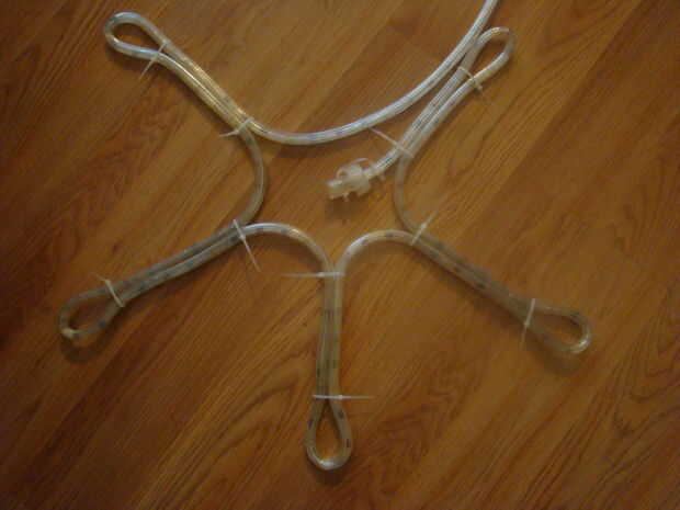 necesito algo para la Navidad para mi delante de la ventana, sobre todo porque destruí la cosa de vidrio de mancha que iba a poner (suspiro). En Pintrest, alguien cubrió una lámpara de pie, hecha con cuerda y luces de la cuerda. Encantador, pero aburrido. Evitar el aburrimiento. Así que decidí tomar la premisa básica y añadir mi propio toque a él. Una torcedura se basó en una alfombra de tela de desecho que hice hace años, y otro es basa en el hecho de que acabo de poner nueva cortina de ducha y se dio cuenta de que aquí había una gran fuente de hilo plástico (plarn: http://www.plasticbagcrafts.com/make-plarn/ ). Así que aquí está cómo hacer una flor de invierno de estrellas LED.
