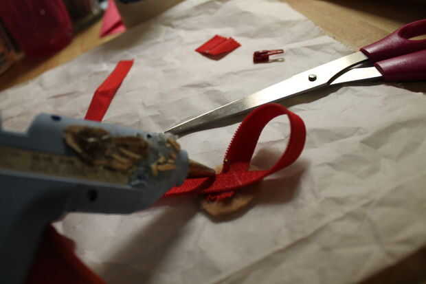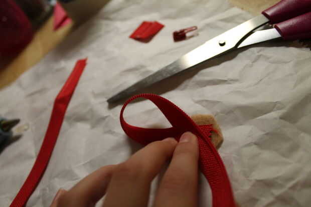 Ahora tome una mitad de la cremallera y la cola uno final a uno de los círculos de fieltro hace un bucle (como se ve en las fotos) para pegar juntos como ir. Luego con el otro extremo de la cremallera llevar en un lazo y pegar a la parte superior.