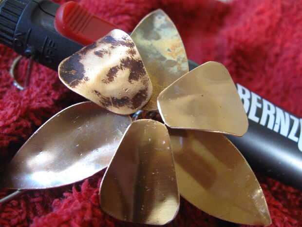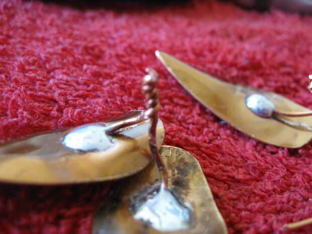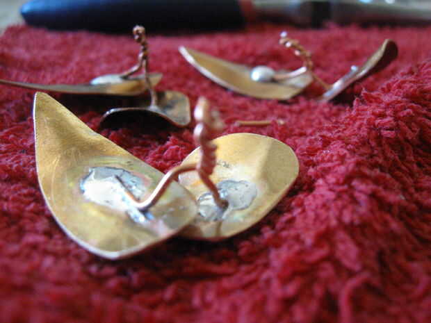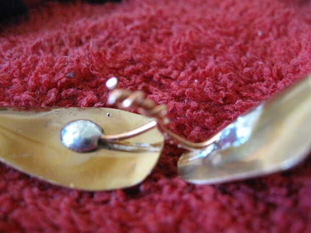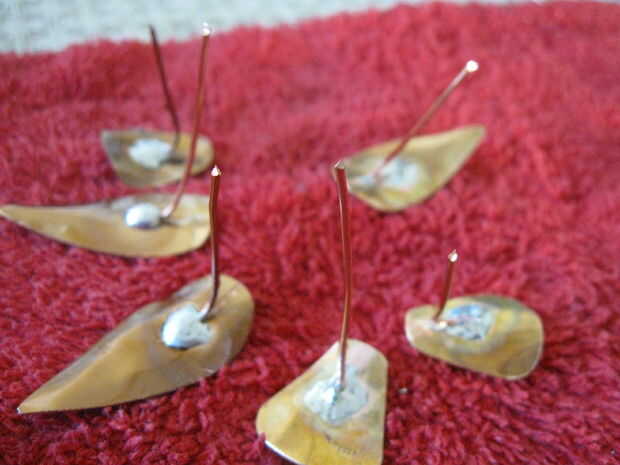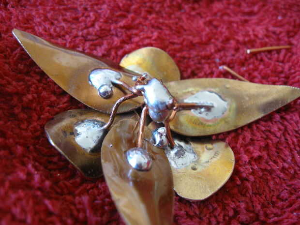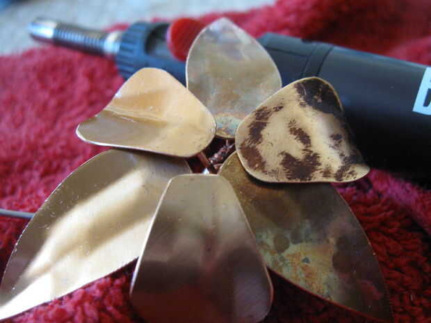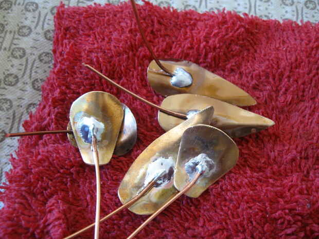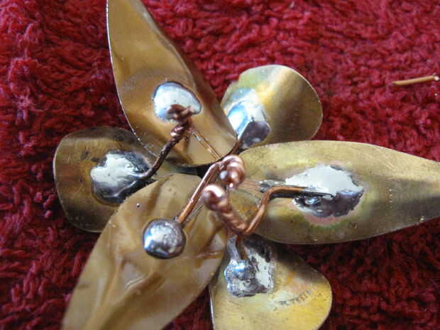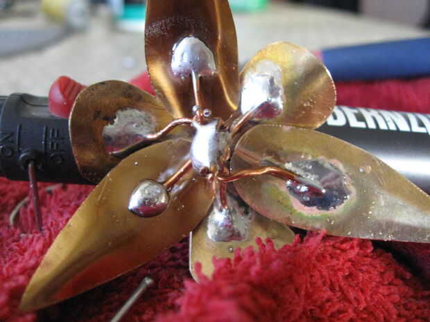 Estos pétalos necesitan tallos poco para unir todo. Es más prudente de los tallos en casi la mitad de la pieza de la soldadura. Aunque es contra-intuitivo que parezca, la flor no puede ensamblarse correctamente de lo contrario. Corte los tallos alrededor de una pulgada y media de longitud para proporcionar un amplio espacio para trabajar con. agarre ambos pétalos y tallo en las quijadas de los alicates en la base del pétalo. Calentar la pieza con la antorcha en el lugar que debe ser fusionado. una vez que la pieza se calienta lo suficiente, retirar del fuego y presione suavemente la soldadura en el lugar deseado. Debe fundir al entrar en contacto y hacer un pequeño charco. Pulse la pieza en la toalla mojada que en mano hay que enfriarlo hasta que se endurece la soldadura.
