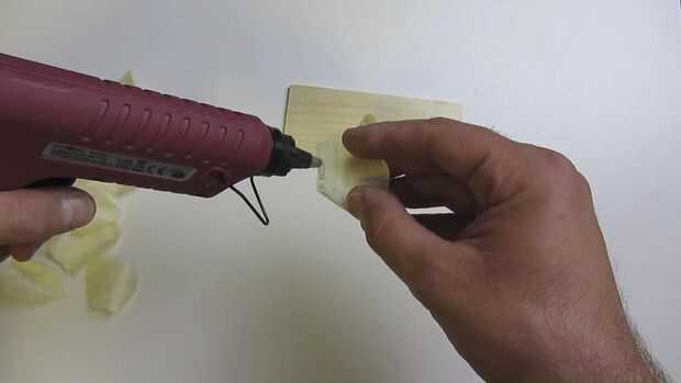 Centro de la flor. Use una gota de pegamento caliente y pega la primera pieza a la base. Puede cubrir la base con cinta adhesiva para mantenerlo más simple separar la flor y la base más tarde.