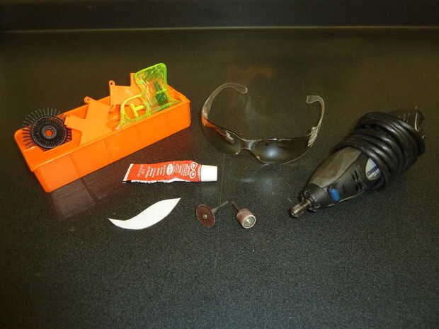 Todo lo que necesitas es: Basura plástica pedazos - necesitará tener verde para el tallo, un color diferente para los pétalos y algo para el centro. Pegamento de modelos Plantilla de pétalo Herramienta Dremel Brocas Dremel Gafas de seguridad