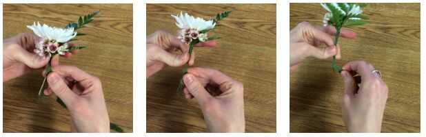 Corte y estiramiento de la cinta (como anteriormente). Desde la base del conjunto de tallos (abrigo un par de veces en la base) y continuar hacia abajo, bien envolver los tallos con cinta floral hasta que los tallos y cable son totalmente envuelto.