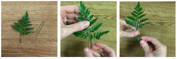 Corte un 5-6" pedazo de alambre (m.); doblar el alambre por la mitad (debe parecerse a una horquilla); enganche el cable a la "rama" más bajo en la vegetación. Cinta verde con la misma técnica como la flor focal (Recuerde estirar ligeramente hasta pegajosa).