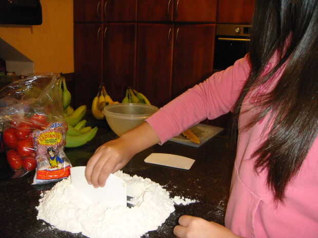 Coloque la harina sobre la superficie donde la masa se va a hacer, luego con una espátula se hace un agujero en el centro de la harina de trigo para agregar allí la levadura.