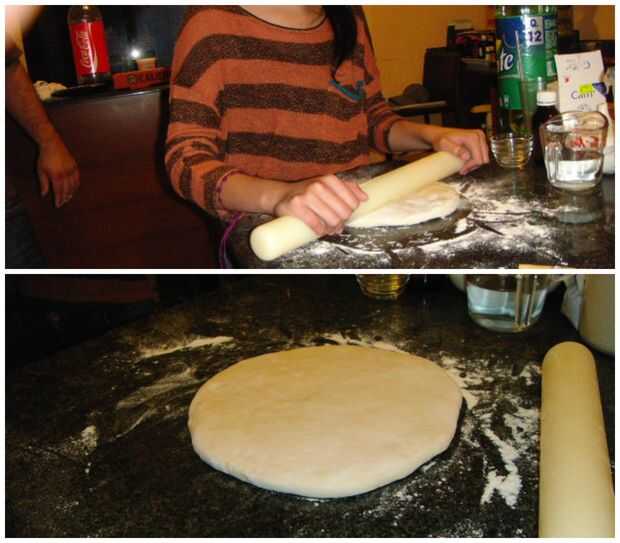 Con un rodillo, se aplana la masa para darle forma circular. Y con un palillo, hacer pequeños orificios para dejar que la respiración de la masa.