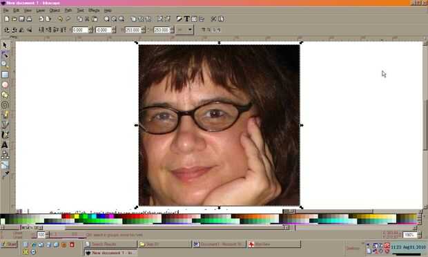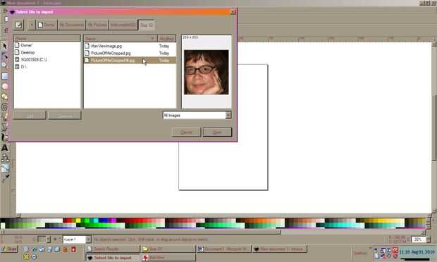 Abrir Inkscape. (Supongo que has conseguido descargar e instalar sin mi ayuda). Mi versión de Inkscape se abre en una ventana pequeña, así que maximizarla. Luego haga clic en "Archivo", luego en "Importar" y navegar a donde colocaste la imagen recortada y selecciónelo. Haga clic en "Abrir". Esto debe traer su imagen en el lienzo en blanco de Inkscape. Note que usted puede mover la imagen importada e incluso redimensionarlo, pero resista la tentación!