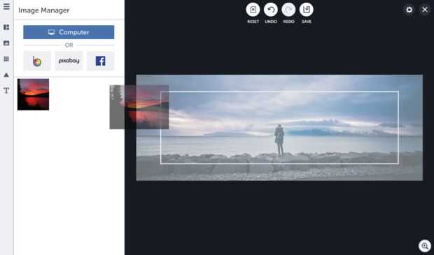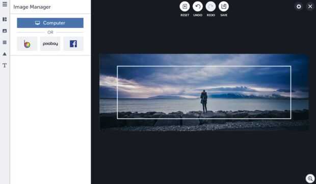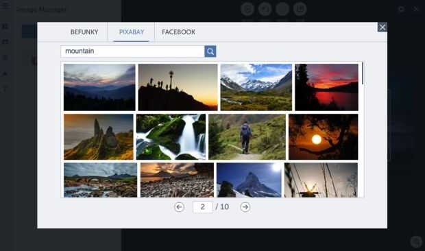 Una vez que la plantilla es agradable y liberado para arriba, luego vas a agregar en un fondo precioso. El diseñador le permite elegir imágenes del propio ordenador, imágenes de Facebook o incluso uno de 440.000 gratis fotos de Pixabay.com. Principal para el administrador de imágenes de la izquierda, seleccione la imagen y haga doble clic o arrastrar y soltar para que sea su fondo.