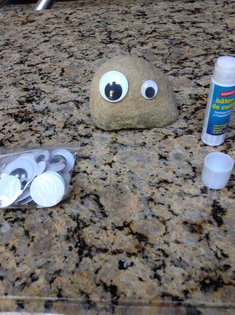 Traer la visión a su roca por su cola y haciendo dos puntos pequeños donde los ojos deben ser. Ahora presione firmemente los ojos saltones hacia abajo. Utilicé dos los tamaño diferentes, pero no importa. Asegúrese de no tocar, todavía está secando!