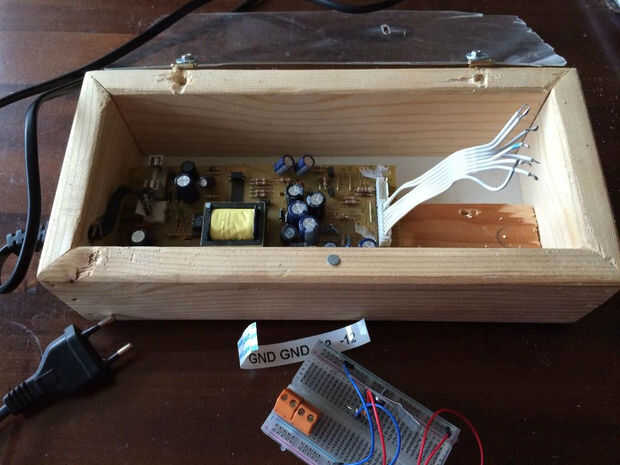 Pensar de una manera que te gustaría tener tu poder presentado en el exterior. Opté por usar un protoboard (a menudo usado para placas de controlador Arduino) en una tapa transparente de la caja.