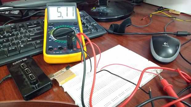 Conexión a su multímetro para protoboard donde usted puede probar la salida de nuestra fuente casera. Si tienes voltaje en el rango de la especificación de USB está listo para ir. Otra cosa busque corto y abierto que son las dos fallas que pasa. Si su breve contacto con la soldadura se siente caliente. (Accidentalmente lo hice haciendo esto!).