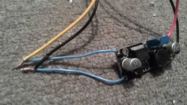 Así el cable amarillo va hacia el enchufe molex, así que 1 cable negro, a continuación, la señal va al regulador de voltaje, donde se regula a 5 V DC y luego el cable rojo sale de eso y también lo hace el otro negro