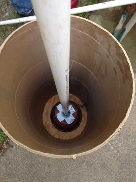 Coloque el cubo en el suelo. Coloqué un viejo pedazo de madera en el piso para que no se pegue. Luego coloque el tubo de la forma sobre el cubo. Otra vez con cinta adhesiva un extremo de la tubería de PVC para que nada irá a través de él. El tiempo del PVC del lugar directamente en el centro del cubo.
