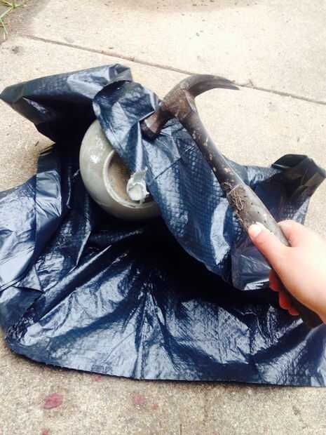 Coloque el globo dentro de una bolsa de basura y golpee el vidrio hasta que se rompe. Romper el vidrio hasta que cae lejos del hormigón, pero no de martillo concreto. Luego desechar el plástico con el vidrio roto. Conducir un palillo a través del tubo de PVC y romper la cinta adhesiva y una capa delgada de concreto en el extremo opuesto. Limpiar los bordes del PVC con un cuchillo.
