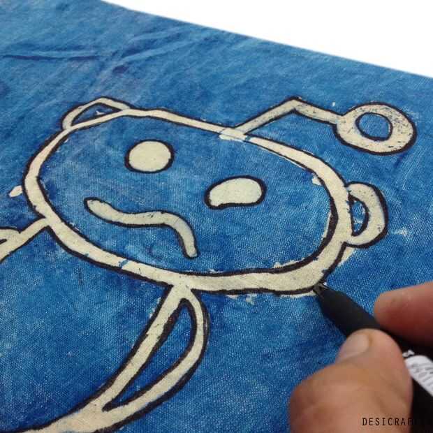 Tomar un rotulador permanente y empezar a hacer esquemas en el patrón, después de haber eliminado toda la cera. Utilizado un rotulador negro para hacer contornos.
