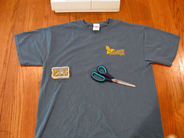 1. una camiseta (yo usé una vieja camiseta de campamento que no encaja) de algodón 2. tijeras 3. un puñado de alfileres de la siembra 4. hilo de rosca 5. una máquina de siembra 6. una almohada que necesitan de un caso