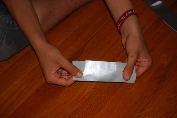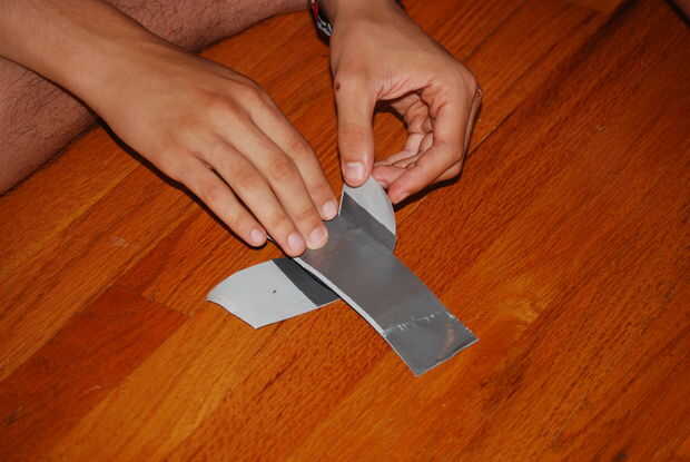 Ahora cortar dos piezas de cinta, otra vez uno largo y uno corto. El largo debe ser aproximadamente 5 pulgadas de largo y el más corto debe ser 3. Poner el pedazo más pequeño en el centro de la pieza más grande. Esto hace que un lado que es totalmente no-pegajoso y una lateral que es parcialmente pegajosa. Doblar la correa en forma de círculo o un óvalo. Poner el resto del envoltura hacia abajo y la cinta perpendicular a la parte larga de la envoltura alrededor de 3 pulgadas para arriba en el pedazo largo de la vaina. UTILIZAR LAS IMÁGENES! AYUDARÁN A EXPLICAR QUÉ HACER!