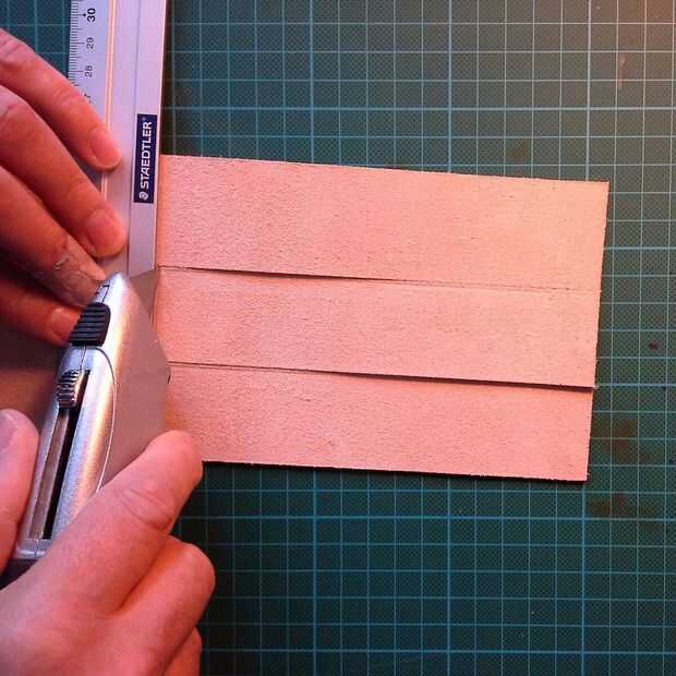 Use la ranuradora de costura para hacer una ranura en el lado de la carne de la piel para crear una línea de plegado. También lo hacen por el lado de la piel pero no en el mismo lugar o a atravesar el cuero.