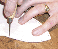 Con un marcador de punto de cuero siga la línea hasta la parte superior, dejar 1 cm por debajo del borde superior, repita este proceso en cada lado, asegúrese de que iniciar y terminar en el mismo lugar, esto asegurará hasta costura. Sigue trabajando en la parte delantera utilizan un punzón y a través del pinchazo en un ligero ángulo hacia el borde hacia fuera de la piel, que tal vez es necesario repetir este proceso cuando se cose a los lados.