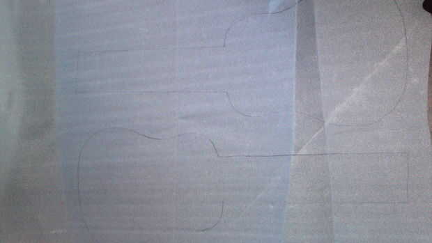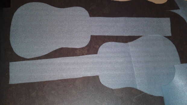 [en lugar de camisetas utilizar paño decente (nilón). debe poder rastrear la guitarra entera y en vez de cartón utiliza la madera prensada o madera contrachapada].