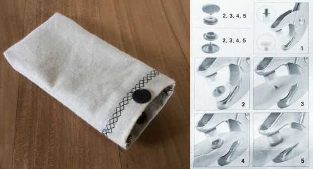 Con una pinza para los sujetadores de la prensa, ojales y piercing, puede elegir qué sistema de bloqueo que desea integrar en su manga personal! Aquí se utilizó un broche de presión color para terminar la funda del teléfono.