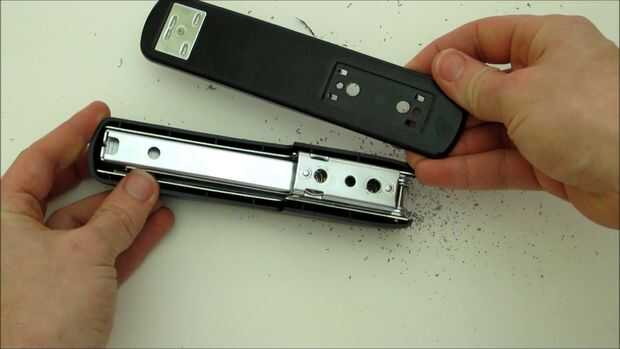 Mayoría de grapadoras se ligan a dos puntos en el stand donde el metal está perforado por los agujeros de la placa base y prensado en su lugar. Para separar las dos mitades de la grapadora, utilice una broca que es un poco más grande que los agujeros de taladro hacia fuera de estas áreas. En la mayoría de aparatos necesita perforar hacia fuera los lados superior e inferior para quitar el metal. En este punto debe desarmarse la grapadora.