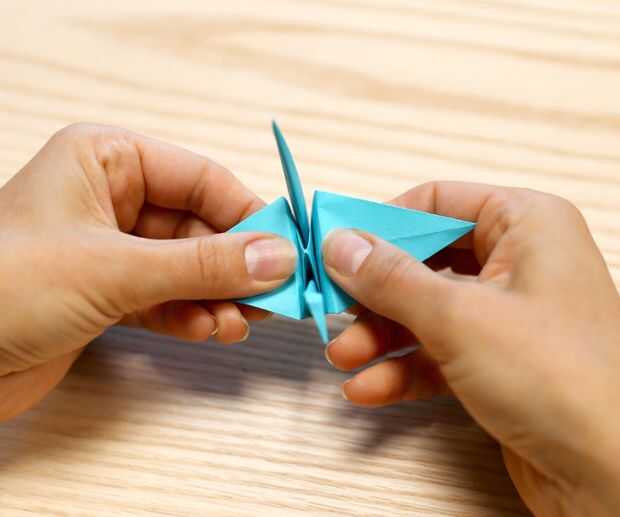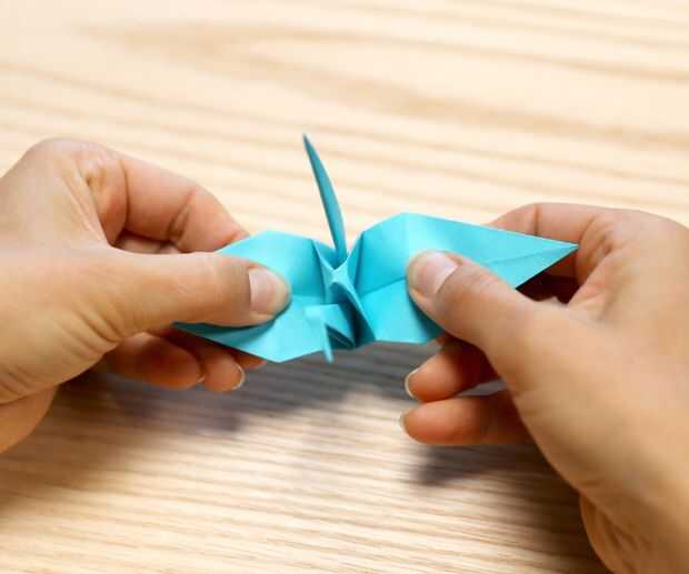 También puedes soplar en el orificio en la parte inferior como pulll hacia fuera las alas para asegurarse de que usted es cuerpo de la grúa está hinchada. Tenga cuidado de no sacar las alas demasiado o a rip. Si el rip alas tienes que reiniciar tu grúa con un nuevo pedazo de papel.