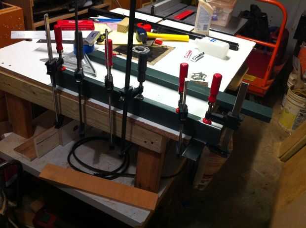 Utilice abrazaderas para sujetar la valla a la mesa. utilizar una pinza en la articulación para realmente darle fuerza y use una escuadra para cuadrado para arriba y esperar 24 horas. Luego realizar un conjunto de rieles para tu valla a montar en el y listo! ¡Buena suerte!