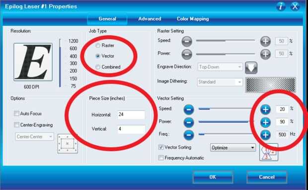 Estos son los ajustes que utilicé para un láser de Epilog 60w: