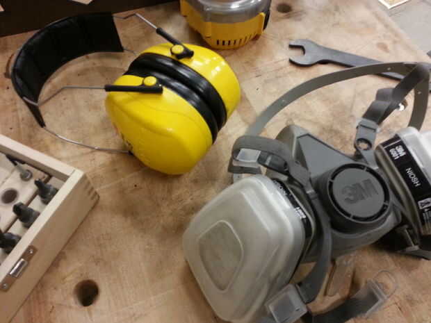 Antes de continuar, coge algunos equipos de seguridad. Routers generan mucho ruido y polvo. Use gafas de seguridad, protección auditiva y de un respirador. Polvo de madera puede ser desagradable y no quiere respirar.