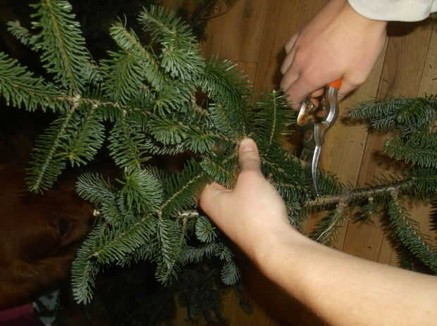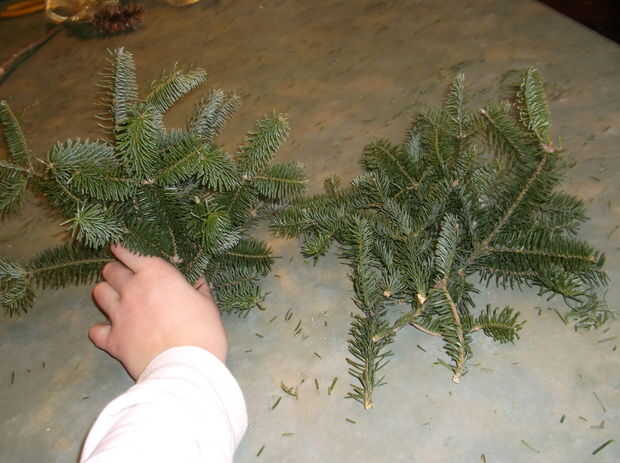 Primero corté sobre ramas de 5-8 sobre un pie de largo para hacer un montón. Usted tendrá que utilizar más o menos ramas para ajustar su elección de espesor. Usted también puede decidir cuánto tiempo hacer los racimos. Coronas más pequeñas tengan más cortas ramas de gigante funerarias con ramas largas que fluye. Pero todas las ramas de una guirnalda deben ser más o menos la misma longitud porque de lo contrario tienes divertidas ramas sobresale