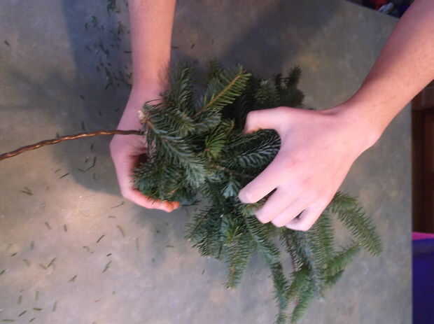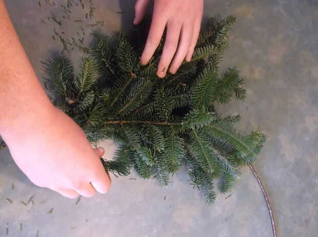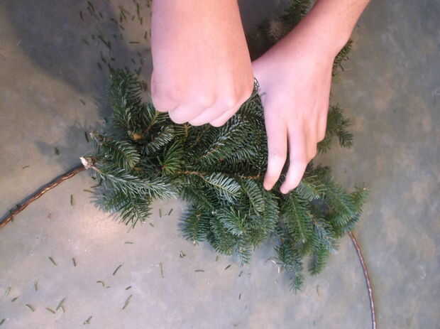 Entonces firmemente envolver el alambre alrededor de un manojo de 5 - 8 veces. Si usted no ajusta lo suficientemente apretada como las ramas se flop alrededor cuando termines. Coloco las ramas dio vuelta más hacia el exterior del anillo que en, pero no mucho.