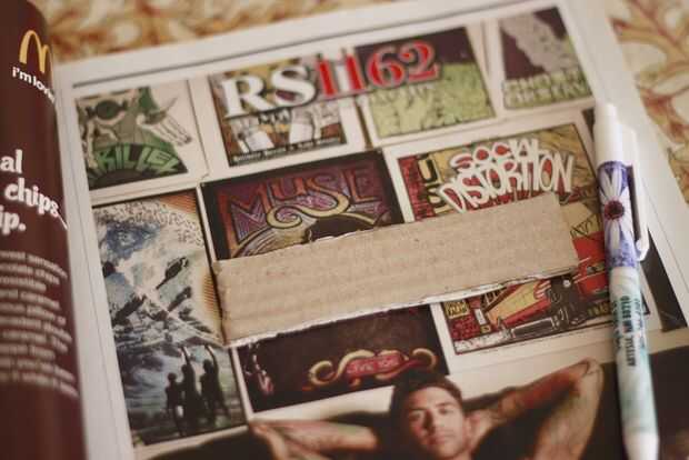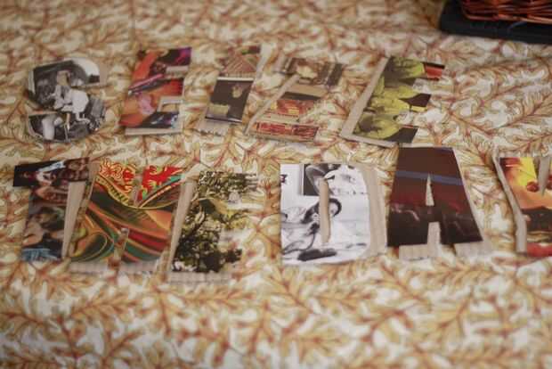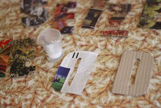 Entonces he encontrado algunas escenas coloridas, caóticas o lo que sea-me-pensamiento-era-cool de algunas páginas de revistas. Me coloca una carta sobre la imagen cool, lo trazó y luego recortar para que coincida con la letra. Lo hice para cada letra. Algunos de ellos eran blanco y negro, mientras que otros tenían toneladas de color, uno era incluso una escena de mi televisión favorita absoluta en el mundo, Breaking Bad (la E pasada en "aprovechar"). Después de eso, mezclé algunos pegamento pegajoso y algo de agua. Probablemente sería más fácil comprar pegamento de decoupage (Mod Podge), pero no tengo ninguna, así que esto es lo que hice. También puede mezclar agua y pegamento de Elmer. Usé mi dedo para obtener poco de pegamento en la parte posterior de la revista carta, y entonces coloqué en la carta de cartón, asegurándose de que emparejó para arriba perfectamente.