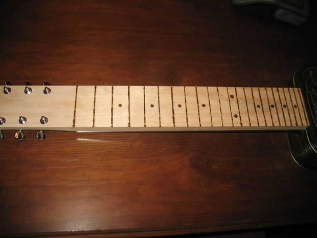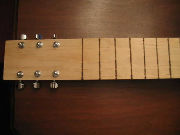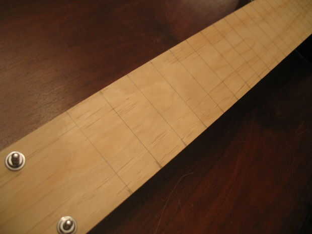 Ya que es una guitarra de acero del regazo y no una guitarra regular en el que las notas son realmente trastes, las líneas de trastes pueden ser dibujadas o marcadas de cualquier manera que usted elija. Usé una herramienta de leña para hacer mis líneas de traste. Existen varias longitudes de escala en la que se puede hacer una guitarra de acero del regazo. Elegí 25 1/2". Coloqué el diapasón contra una de mis guitarras de Fender, que es también 25 1/2" para obtener las medidas de la línea de los trastes. Si usted desea o requiere una escala diferente una calculadora diapasón puede encontrarse en Stewmac.com.