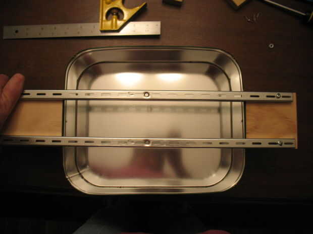 Después que el diapasón luego até el tubo de desagüe. Coloqué la caja de galletas en el medio para obtener una medida exacta. Dos tornillos fueron suficientes. Me lo entregaron y ponga la tapa en este momento, para comprobar las miradas. Hasta ahora, bien.