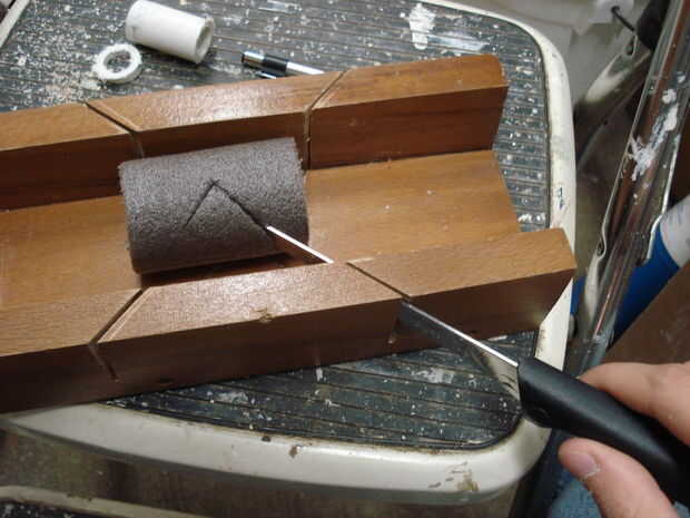 La espuma no está lista aún. Usted tendrá que cortar para arriba un poco para que quepa en 1/2" PVC. Tome uno de 2.5" pedazos de espuma. El plan es cortar una cuña en la espuma de manera que podemos caber sobre un tee de PVC de 1/2". Usé una caja de ingletes para ayudar. Usted necesitará encontrar la ranura en la espuma, luego gírelo un cuarto de vuelta y marque el centro. Entonces desea dibujar dos líneas que forman un ángulo recto en el punto que marcaste (ver imagen). Encontré más fácil de iniciar los cortes con un cuchillo y hacer el resto del corte con un cuchillo de cocina dentada. Usted debe terminar con una cuña de Niza 90 grados de la espuma. El último paso de esta pieza es cortar a través de la fisura en la espuma de manera que se puede abrir.
