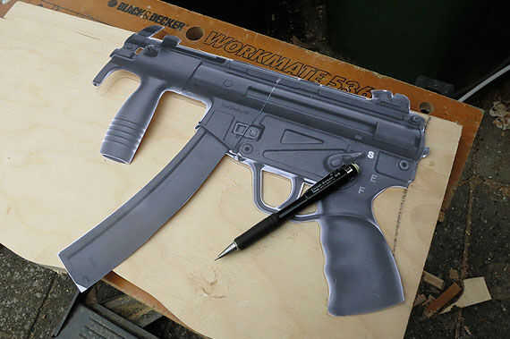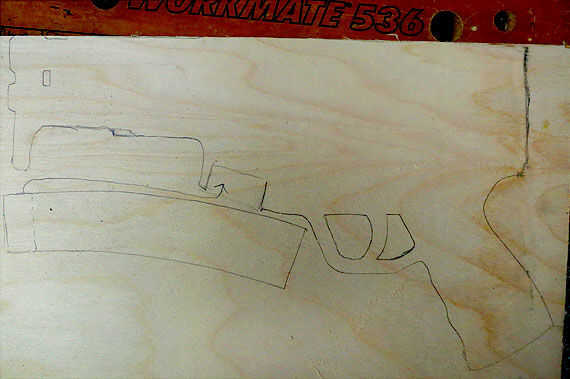 Utilice la plantilla para elaborar la forma de armas de fuego sobre madera contrachapada de 18 mm. Dependiendo del nivel de detalle, puede corta algunas de la broca pequeña de su impresión y dibujarlos en 3 o 5 mm de madera contrachapada, así. Saqué la revista como un pedazo separado así que no pierdo mucho la madera. Tampoco podría utilizar esto para hacer la revista detouchable. En ese caso, deberás hacer algún tipo de retén, para que no caiga hacia fuera por él mismo.