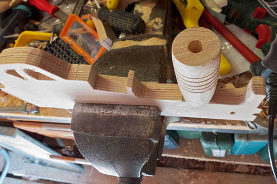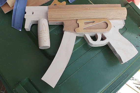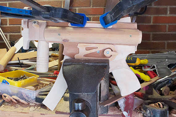 Una vez que haya todos los bits de cortan y lija, estás listo para poner todo junto. Normalmente utilizo pegamento y tornillos. A ser la manija delantera suficiente estabilidad, tuve que taladrar un agujero en el mango entero y utilice un tornillo muy largo.