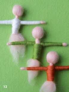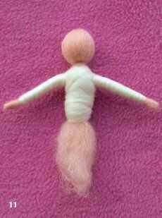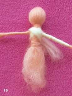 A partir de la muñeca, una fina capa de lana color rosa alrededor del brazo del viento. Dejar las manos (Figura 10). Viento de tres a cuatro capas finas de lana alrededor del brazo entero. Hacer que las capas más gruesas hacia la parte superior para dar el brazo de una forma realista. Repita en el otro lado. Viento con cuidado alrededor del cuerpo transversalmente. Asegúrese de que la hebra de lana no se tuerza y se hiere uniformemente y firmemente alrededor del cuerpo (figuras 11 y 12). Fibras de seda verde viento de través