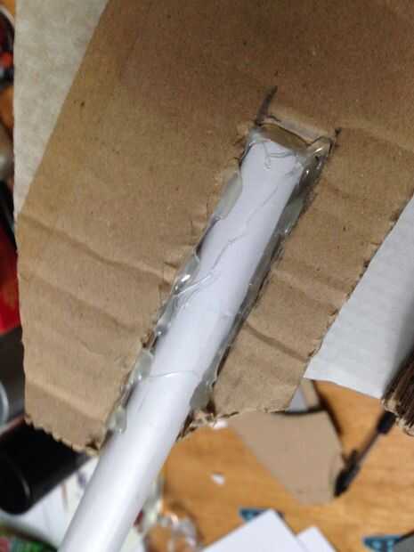 Cortar dos formas de rectángulo de la parte delantera de las capas internas. Sí, estamos introduciendo una linterna. Encontrar un barril adecuado. Esto puede ser cualquier cosa, desde un tubo de cartón de un rollo de papel durable. Pegue el cañón, pero no la linterna, ya que podría dañar la linterna. Porque no estamos pegando la linterna, hacer que haces demasiado pequeño para no caber la muesca de la linterna, pero no demasiado grande para que pueda caer fácilmente. Debe quedar ceñido sin ninguÌ n pegamento,