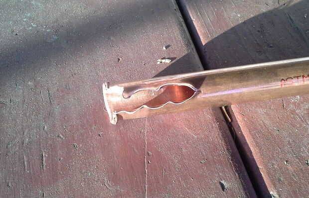 ADVERTENCIA: Si en el proceso de doblado, al final de las fracturas de tubo de cobre ligeramente que el tubo no se puede utilizar en el proyecto. Cualquier defecto o fractura del tubo resultará en fracaso. Esto le pasó a uno de mis tubos, pensé "Yo puedo reemplazarlo más adelante" pero no pasó mucho tiempo para que falle. Ver la última foto.