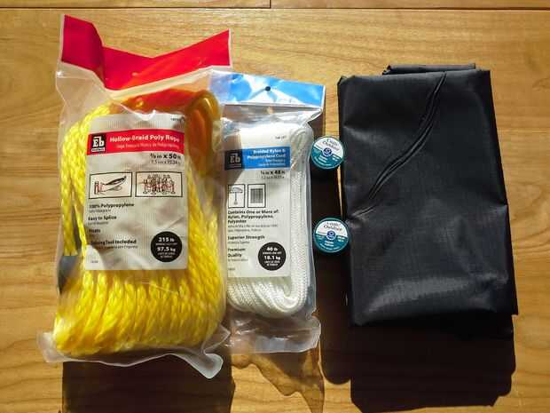 Usted necesita algo que no se estirará. (Paracord no es una buena opción). Usé trenza hueco polypropoylene cuerda que está clasificado de 215 libras. Una clasificación de alrededor de 115 libras probablemente funcionaría bien ya que el peso se distribuye entre las 2 cuerdas y lazo 4 offs.