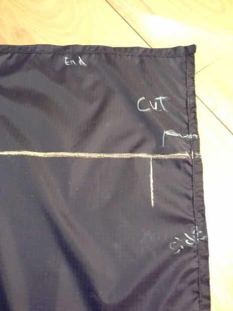 Para crear una hamaca más fuerte necesitamos los lugares donde se tiran el tubo y la cuerda por el dobladillo. Idealmente queremos hacer esto por lo que no hay corte las orillas expuestas. Si usted tiene una pulgada de superposición (la parte que usted cose juntos para fijar el extremo) y luego la línea de corte debe ser menos de una pulgada lejos de la línea de doblez. Refiera a los cuadros. El siguiente paso le ayudará a aclarar por qué se está haciendo este corte donde se está realizando.