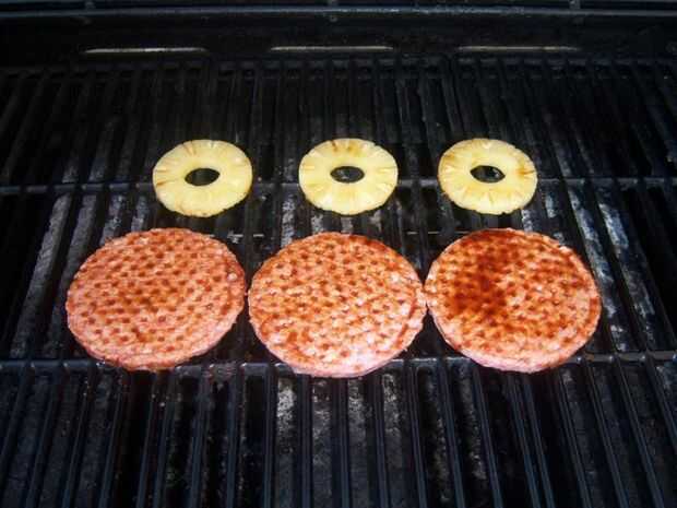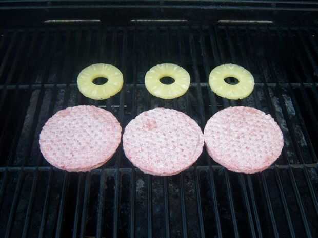 Coloque sus hamburguesas y una rodaja de piña para cada hamburguesa a la parrilla.