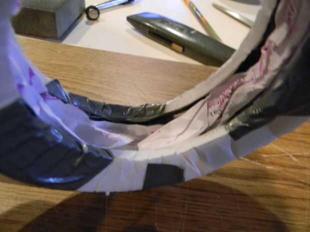 Materia del anillo mitades con periódico (utilicé papel regular) para añadir estructura y masa. Luego con cinta adhesiva los dos anillos juntos.